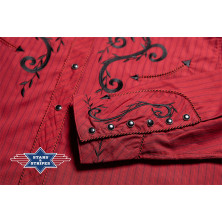 Squisita camicia western con splendidi ricami sul petto, sulla schiena, sui polsini e sul colletto. Carré western ricamato. I polsini, l'abbottonatura e il colletto in stile western sono impreziositi da bordini in corda bicolore. I taschini ,tipo pocket smile , sono reali. Polsini a sei bottoni. Bottoni automatici. 35% viscosa - 65% poliestere. Abbinabile alla camicia Catherine.