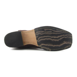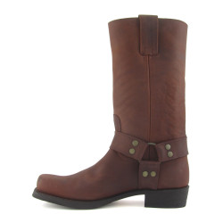Stivale in pelle bovina ingrassata ,con fascetta e anello in metallo. Suola in cuoio con soletta protettiva in gomma. Cuciture Goodyear Welted. Altezza stivale 35 cm  circa. Altezza tacco 4 cm circa.