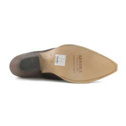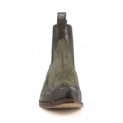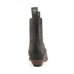 Stivale tronchetto Sendra in pelle bovina con classico motivo a giglio e inserti in pitone.Tacco ibiza e orma cuervo. Cuciture Goodyear Welted e suola in cuoio. Altezza stivale :21 cm circa. Altezza tacco : 4,5 cm circa.100% pelle . Made in Spain.