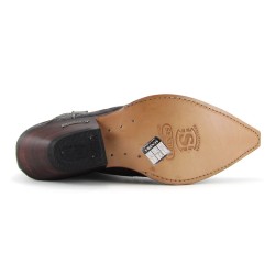 Stivale Sendra in pelle bovina con aspetto invecchiato. Singolari intarsi con inserto in pitone , caratterizzano la mascherina e l'asta. Altezza stivale : 36 cm. Altezza tacco : 4,5 cm. Cuciture Goodyear e suola in cuoio. Punta cuervo e tacco ibiza. 100% pelle. Made in Spain.
