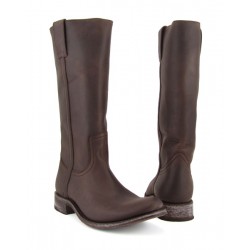 Stivale Sendra in pelle bovina ingrassata . Tacco dritto e punta arrotondata. . Suola in cuoio , dall'aspetto vissuto e cuciture Goodyear. Altezza stivale : 38 cm. Altezza tacco: 3,5 cm. 100% pelle. Made in Spain.