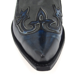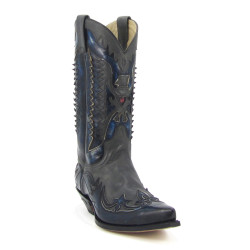 Stivale Sendra in pelle bovina con giglio sul piede e aquila intarsiata sull'asta. Suola in cuoio e cuciture Goodyear Welted.Punta cuervo e tacco ibiza. Altezza stivale 36 cm circa. Altezza tacco 4,5 cm circa. 100% pelle. Made in Spain.