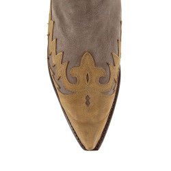 Stivale Sendra in stile texano , realizzato in pelle bovina lavorata con effetto oxido. Punta cuervo e tacco ibiza. Altezza stivale : 36 cm circa. Altezza tacco : 4,5 cm circa. Suola in cuoio e cuciture Goodyear Welted. 100% pelle. Made in Spain.
