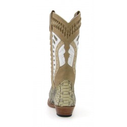 Stivale Sendra in pelle di pitone con intarsiata sull'asta , la testa di un indiano. Orma pico. Tacco ibiza. Suola in cuoio e cuciture Goodyear. Altezza stivale 35 cm circa. Altezza tacco 4 cm circa. 100% pelle . Made in Spain.