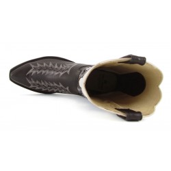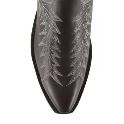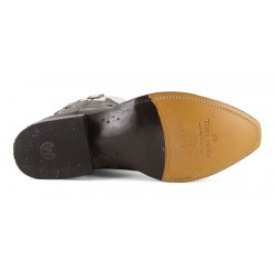 Stivale Tony Mora con ricami sul piede e inserti in contrasto sull'asta. Suola in cuoio e cuciture Goodyear. Altezza stivale 35 cm circa. Altezza tacco 3,5 cm. 100% pelle. Made in Spain.